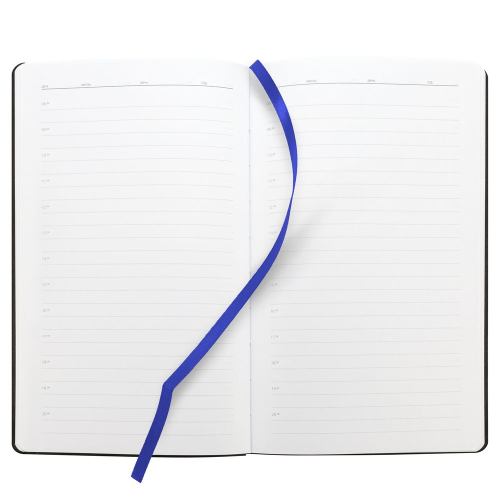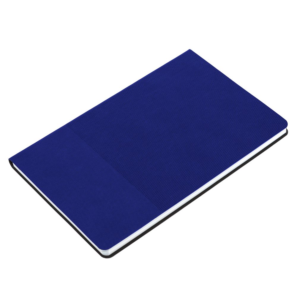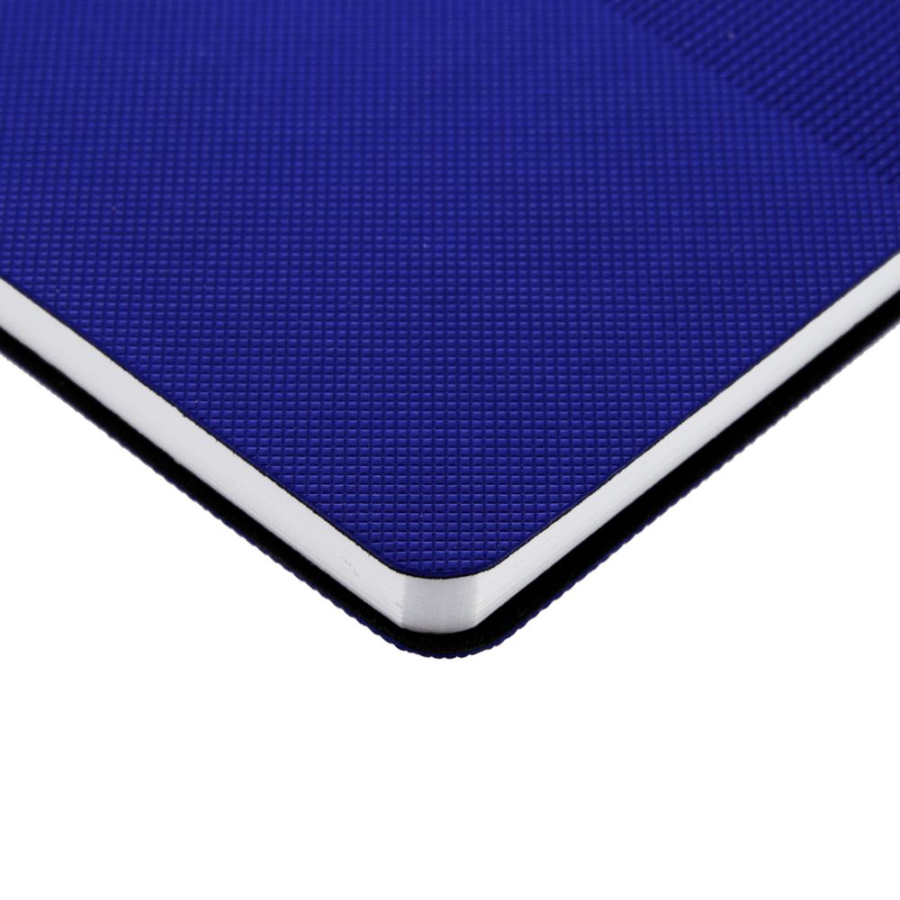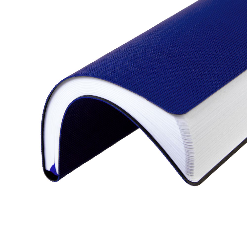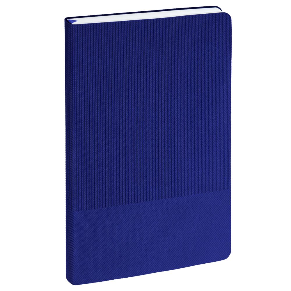 Ежедневник с гибкой обложкой, выполнен из материала Canyon, синий НН, дополнен ляссе в цвет обложки. Блинтовое тиснение на обложке создает эффект вязаного полотна.