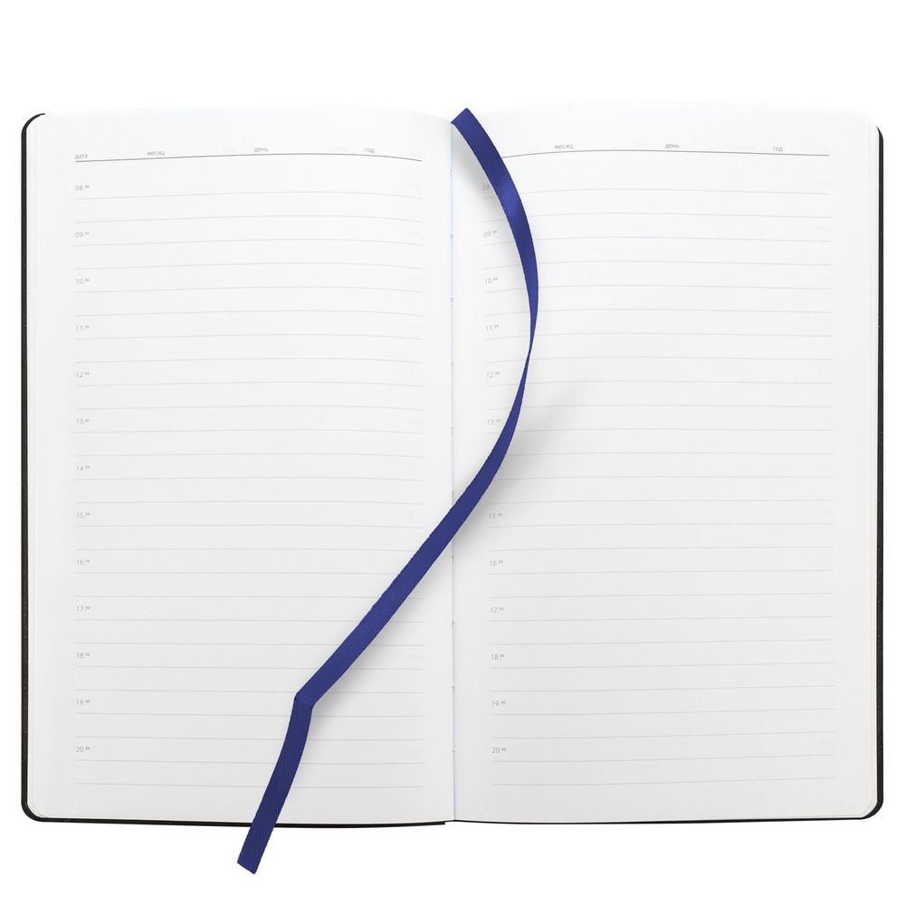 Ежедневник с гибкой обложкой, выполнен из материала Canyon, темно-синий ХХ, дополнен ляссе в цвет обложки. Блинтовое тиснение на обложке создает эффект вязаного полотна.