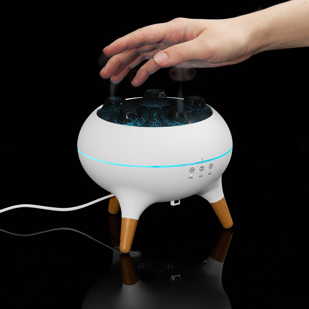Помимо стандартных струек пара посередине крышки, Cloudini умеет выпускать маленькие облачка влажного воздуха из 5 отверстий по окружности поочередно или динамически — в такт музыке. Устройство реагирует на звуковые колебания и выстраивает интенсивность распыления в зависимости от мелодии.