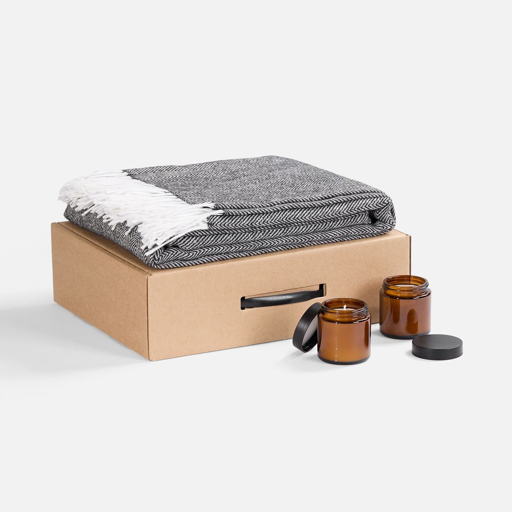 • Материал: плед - шерсть, 15 %; хлопок, 5 %; полиэстер, 60 %; акрил, 20%, плотность 200 г/м²; подсвечник - стекло, крышка - пластик; свеча - парафин, соевый воск, парфюмерная композиция; коробка - микрогофрокартон, Т-23Е