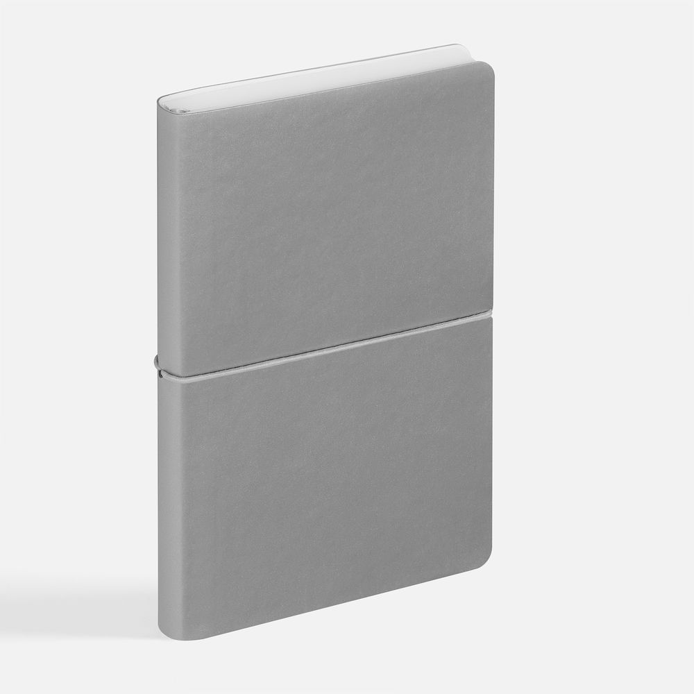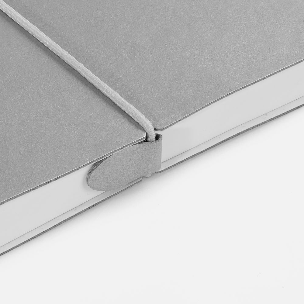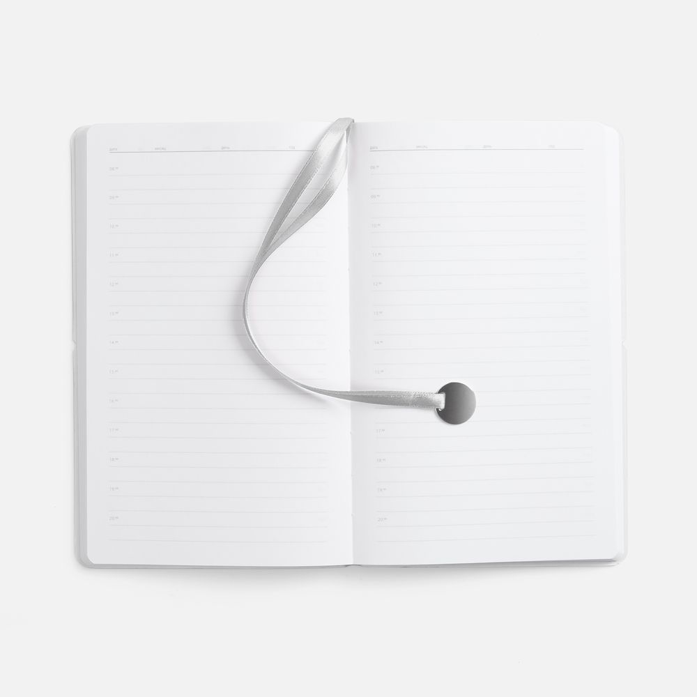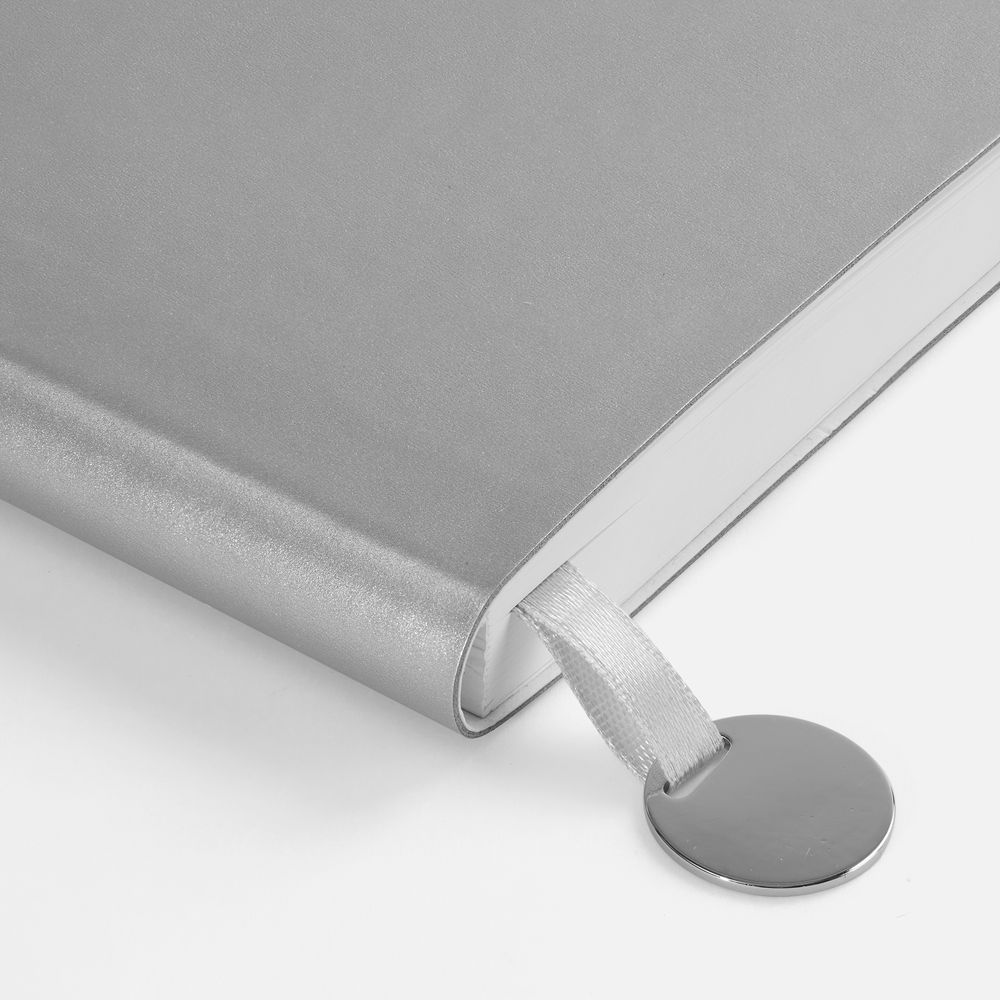 Ежедневник с гибкой обложкой, выполнен из материала Waltz, серебристый DD, дополнен ляссе в цвет обложки с металлическим шильдом.