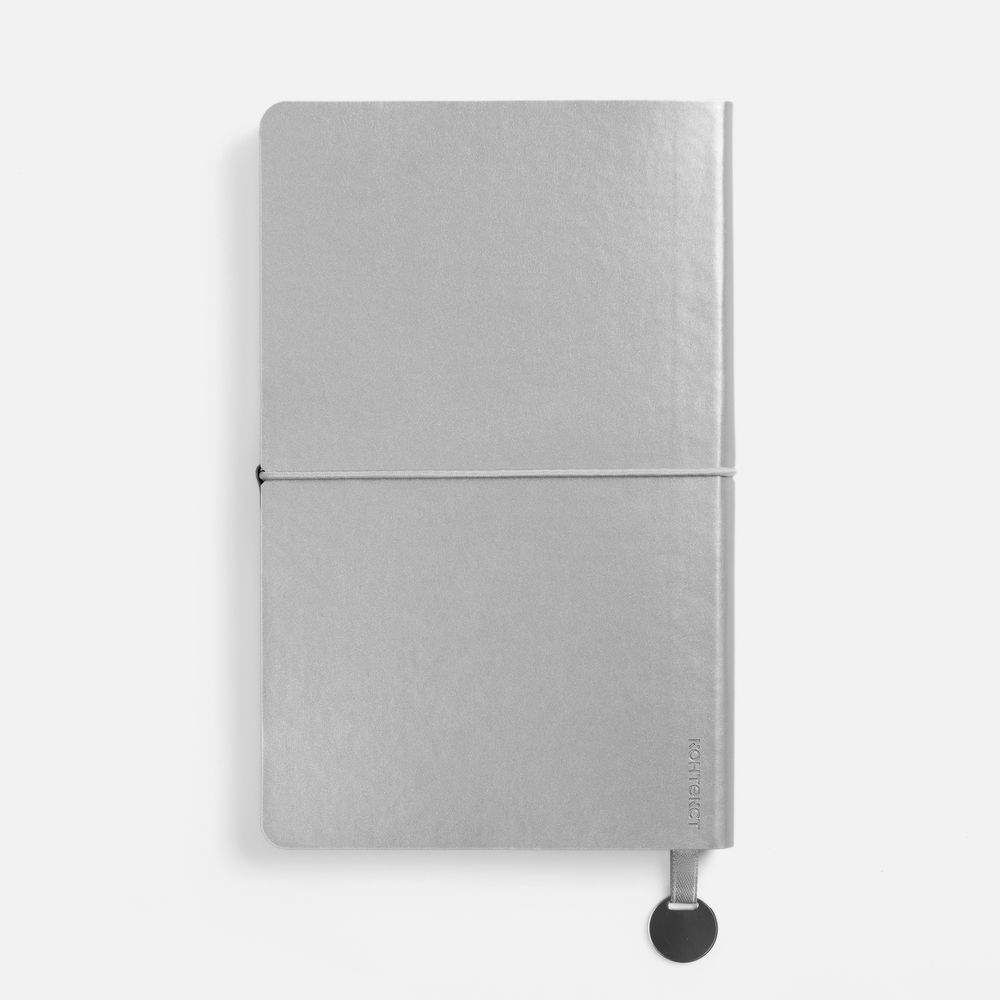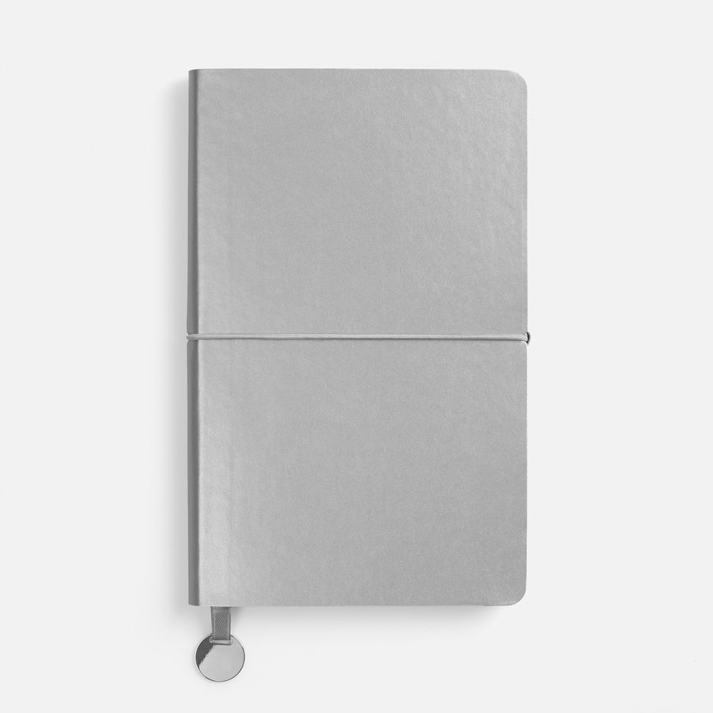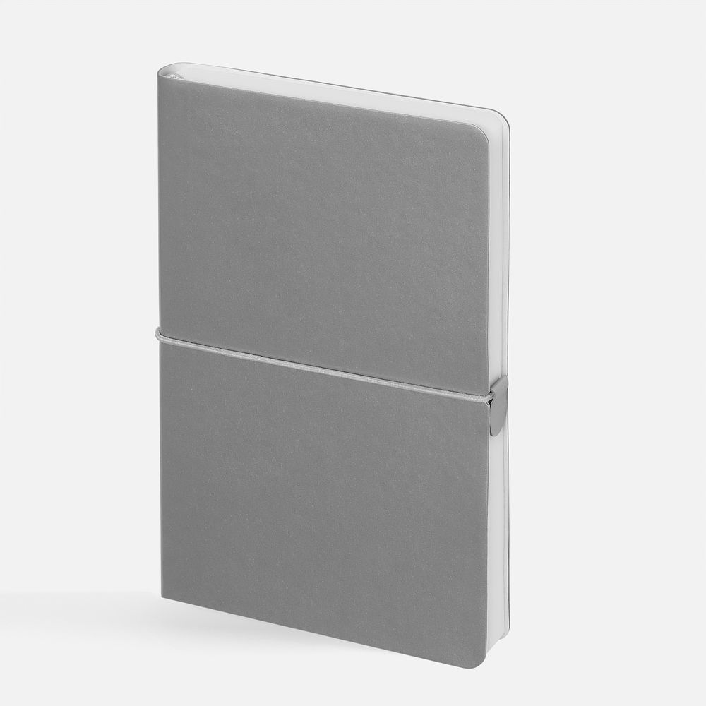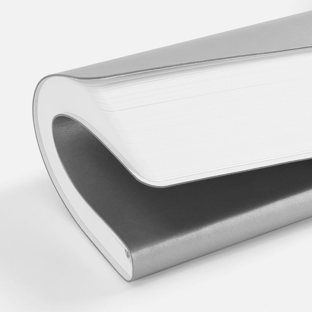 Ежедневник с гибкой обложкой, выполнен из материала Waltz, серебристый DD, дополнен ляссе в цвет обложки с металлическим шильдом.