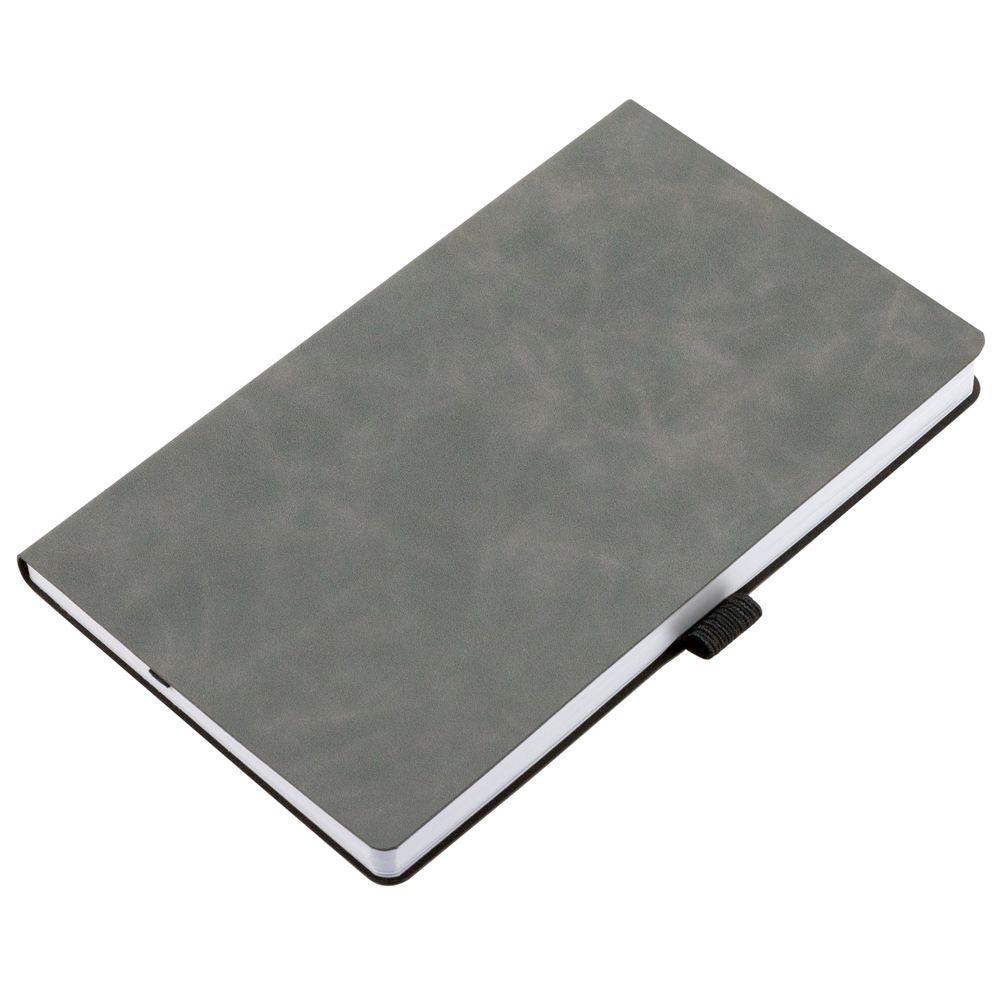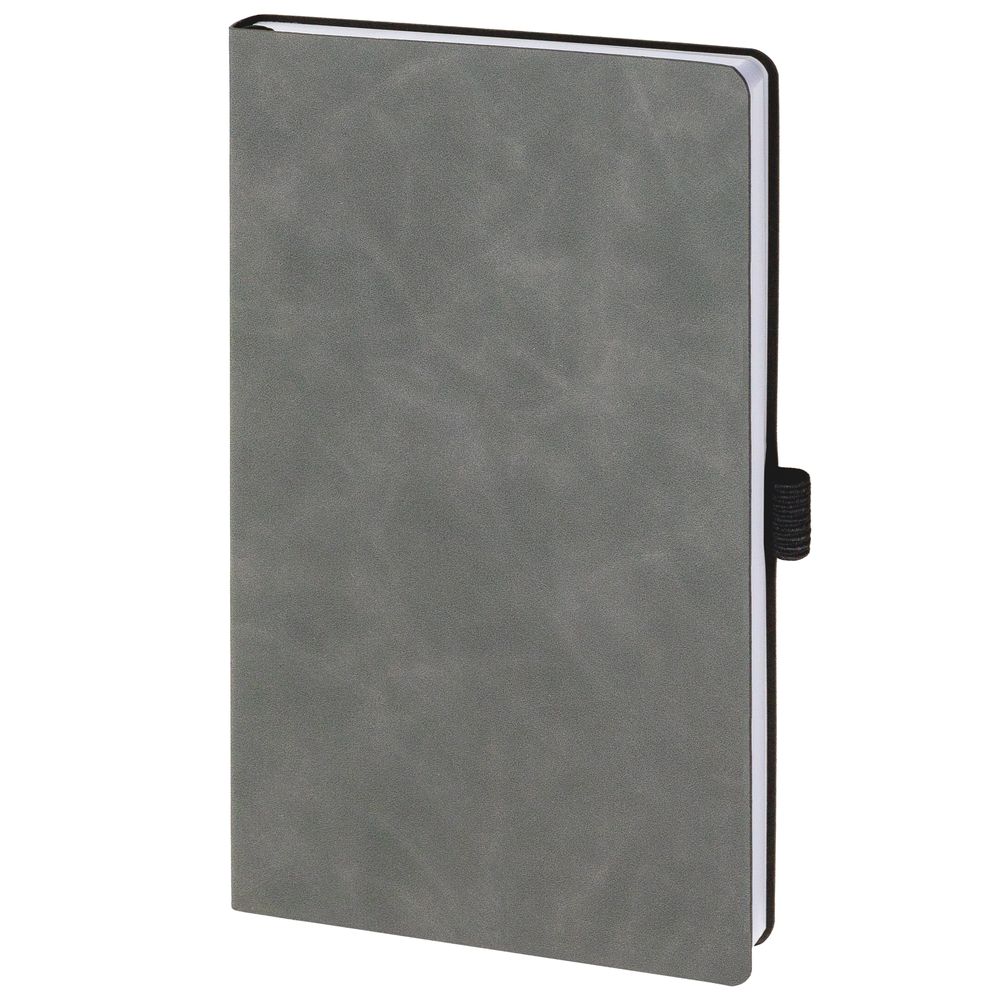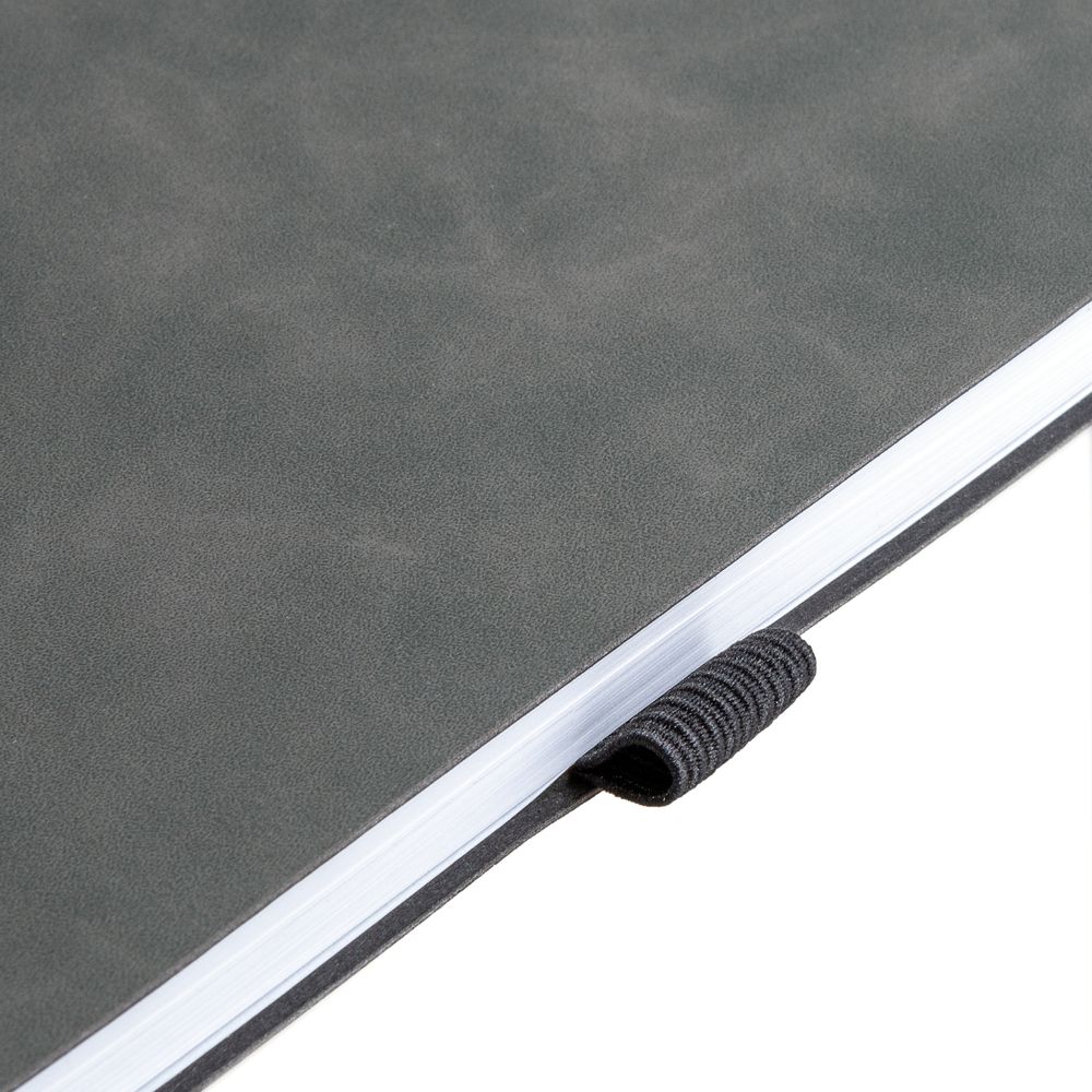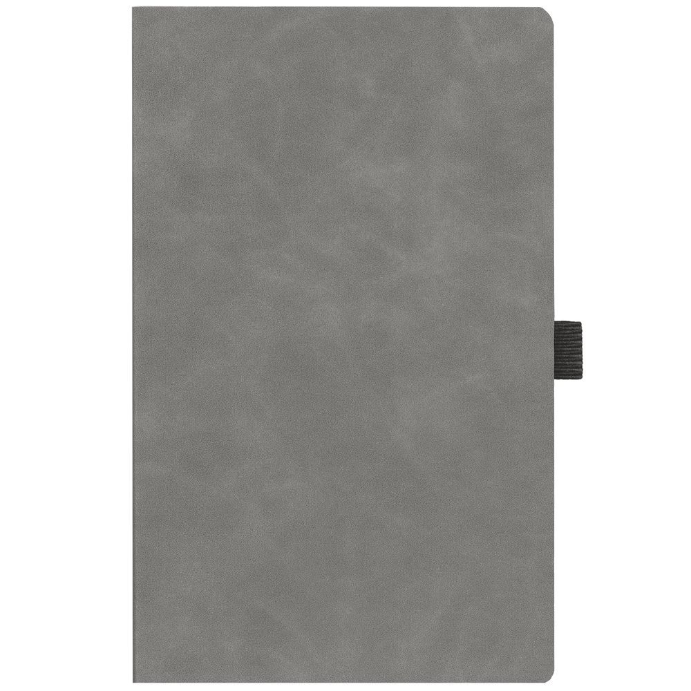 Ежедневник с гибкой обложкой, выполнен из материала Nubuck Touch, темно-серый EE, дополнен ляссе и петлей-резинкой для ручки черного цвета.