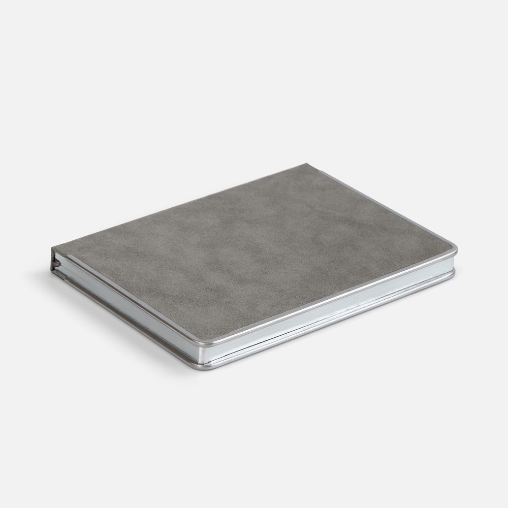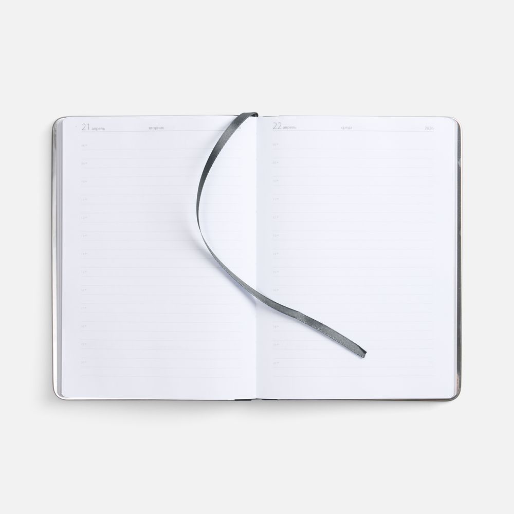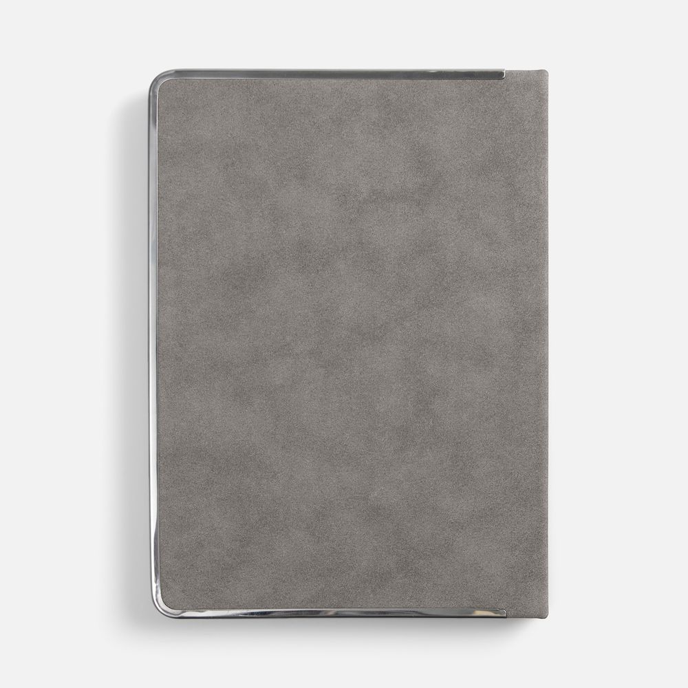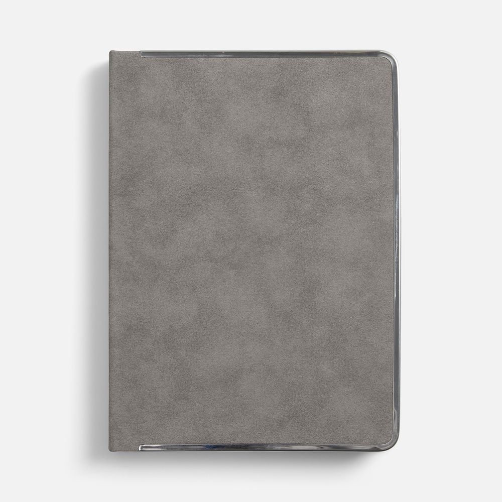Ежедневник с твердой обложкой и серебристым обрезом блока. Выполнен из материала Nubuck, серый СС, дополнен серым ляссе и металлическими рамками с двух сторон обложки. Блок 256:
