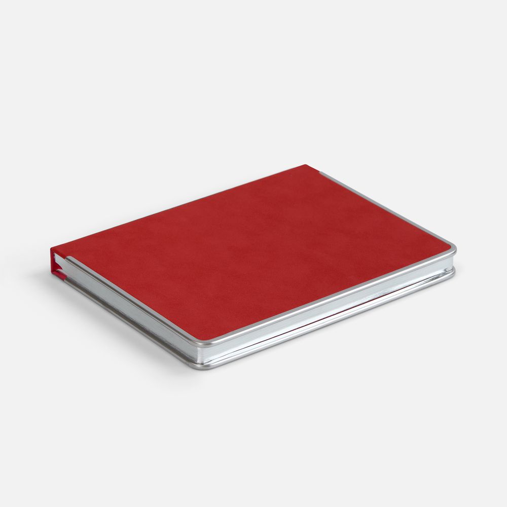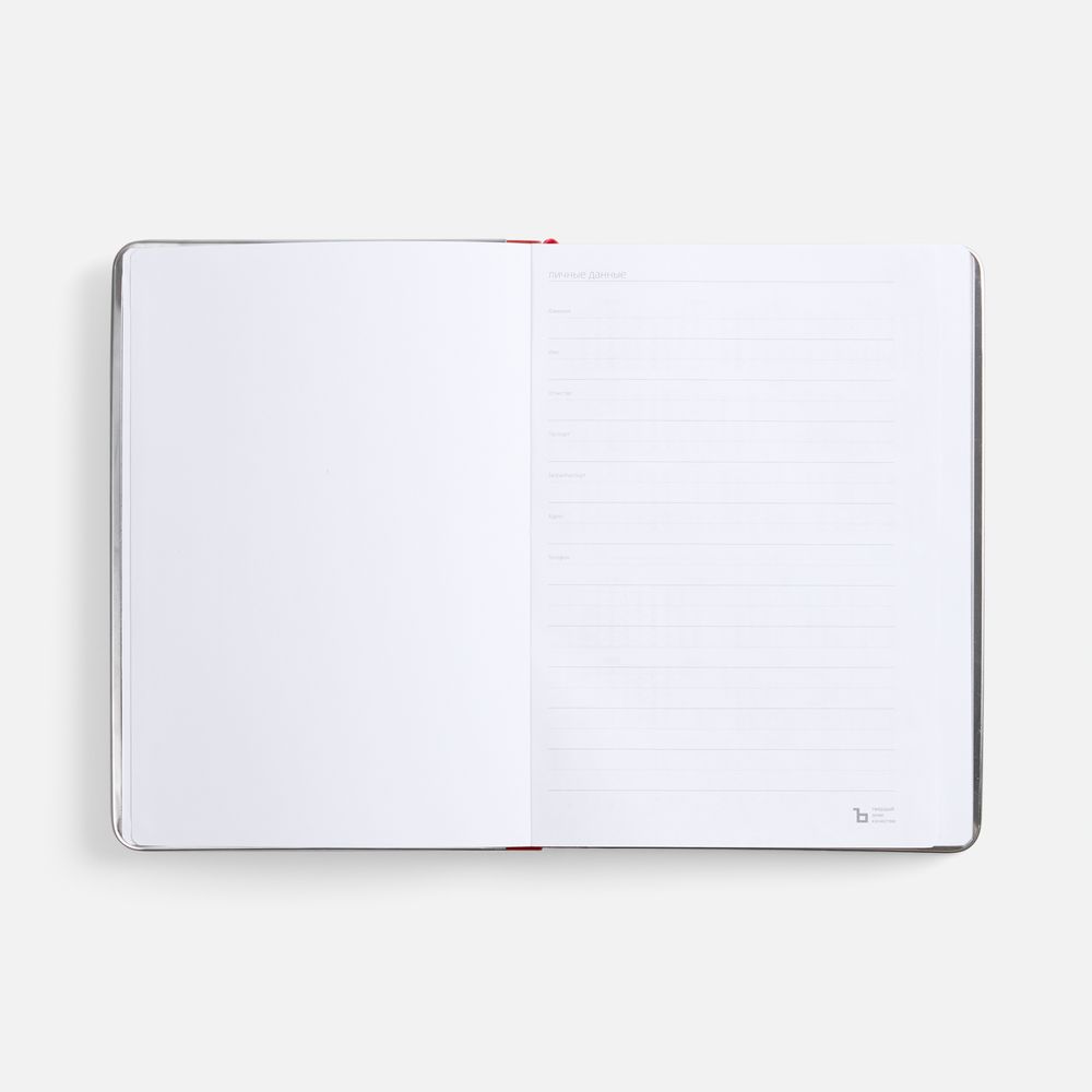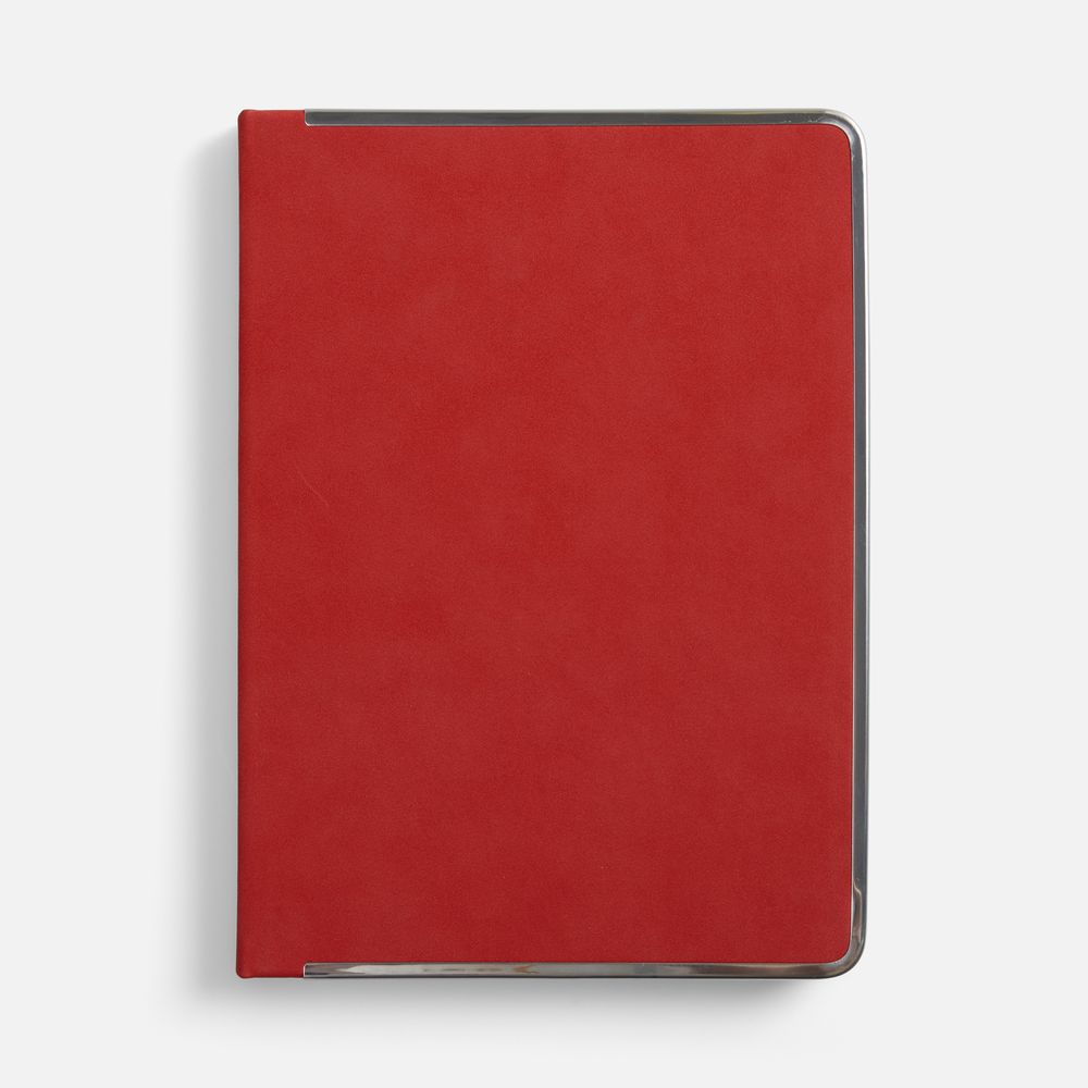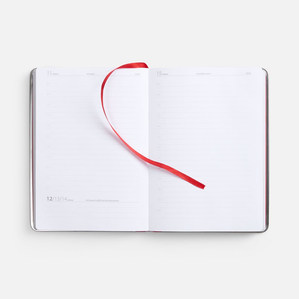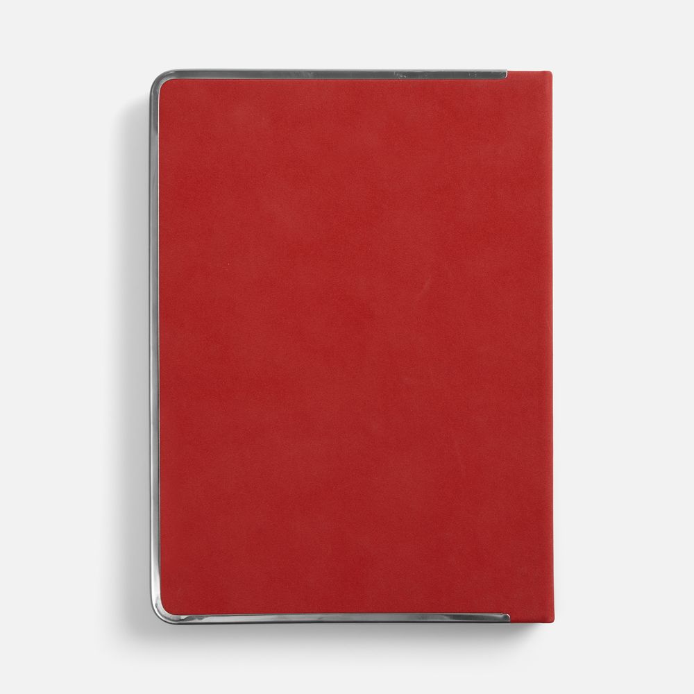 Ежедневник с твердой обложкой и серебристым обрезом блока. Выполнен из материала Nubuck, красный РР, дополнен красным ляссе и металлическими рамками с двух сторон обложки. Блок 256: