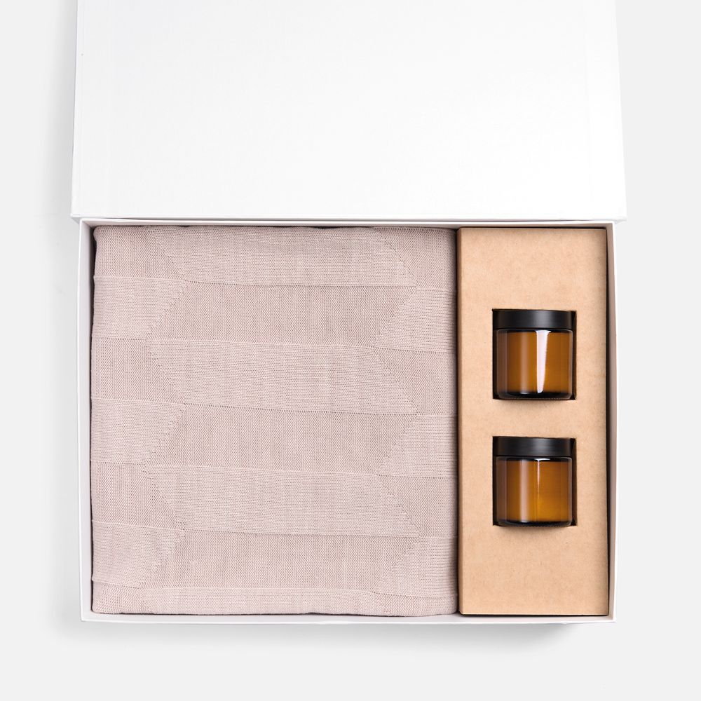 • Материал: плед - акрил 100%, плотность 286 г/м²; подсвечник - стекло, крышка - пластик; свеча - парафин, соевый воск, парфюмерная композиция; коробка - переплетный картон, бумага Majestic