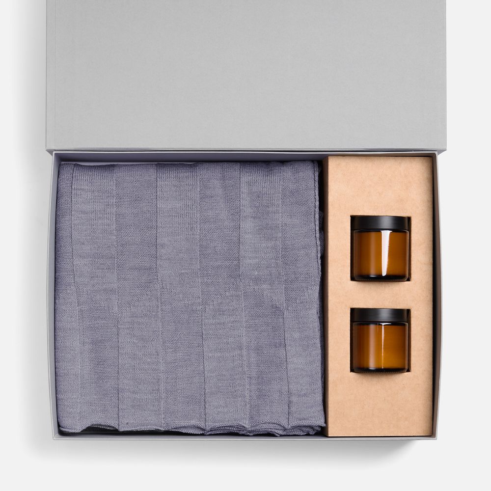 • Материал: плед - акрил 100%, плотность 286 г/м²; подсвечник - стекло, крышка - пластик; свеча - парафин, соевый воск, парфюмерная композиция; коробка - переплетный картон, бумага Malmero