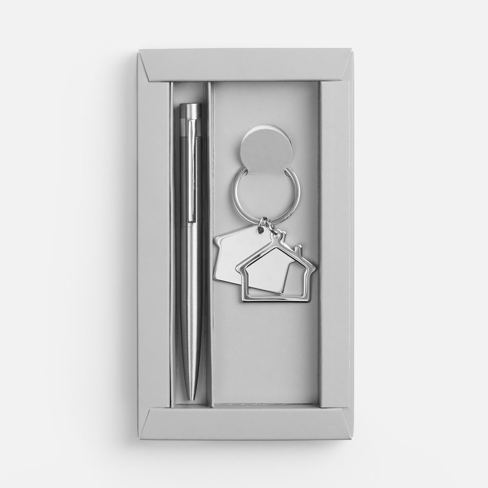Шариковая ручка в матовом корпусе из переработанной стали не только подчеркивает заботу об экологии, но и дарит уверенность в каждом слове. Металлический брелок с подвесками в форме домика — идеальный промосувенир для строительных компаний, агентств недвижимости и ремонтных сервисов.