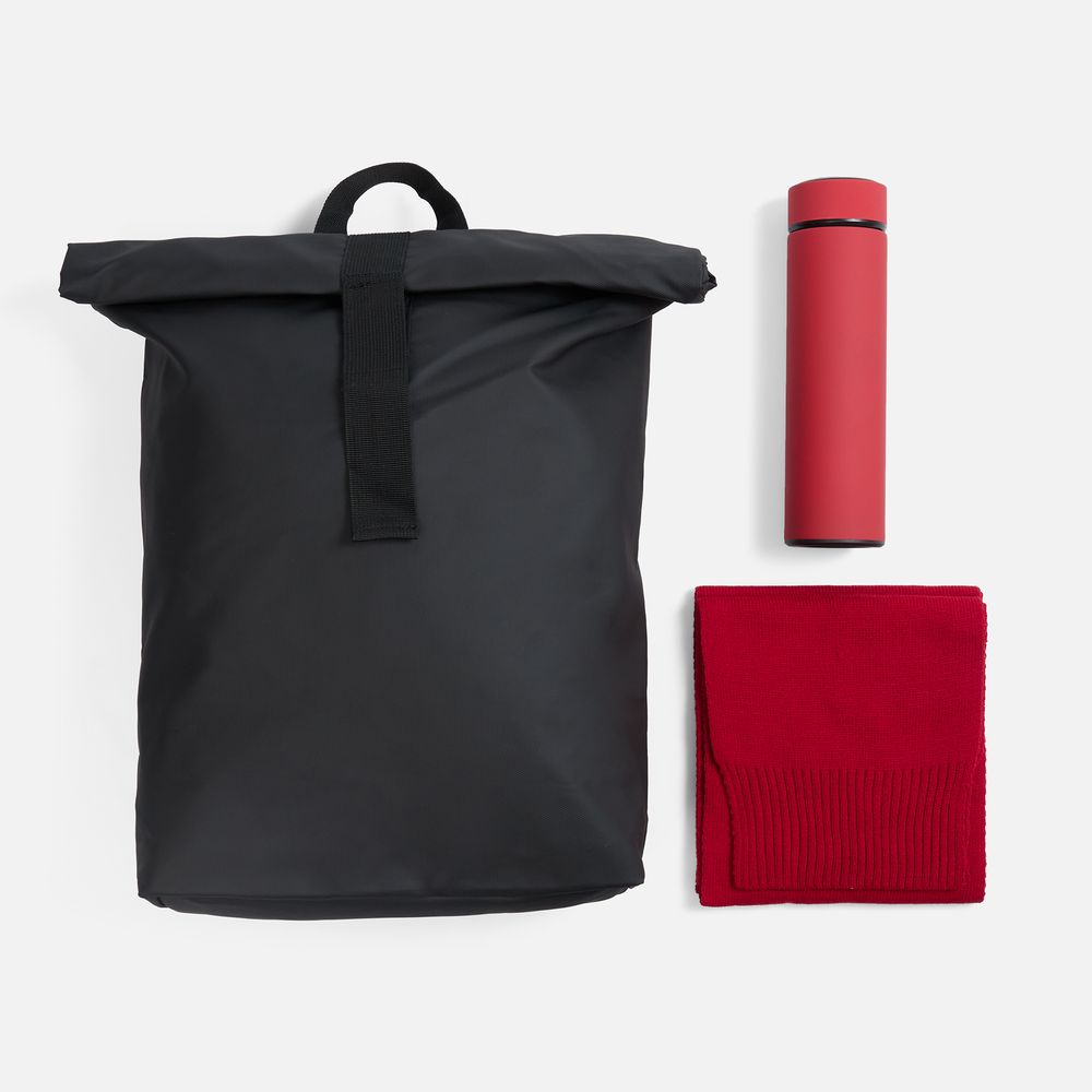 Составляющие набора — шарф и термос — помогут оставаться стильным и, что немаловажно, довольным даже в холодное время года. Модный и практичный рюкзак с удобной регулировкой объема роллтоп всегда подстроится под ситуацию, а потому станет просто незаменим как ежедневно в городе, так и в путешествии.