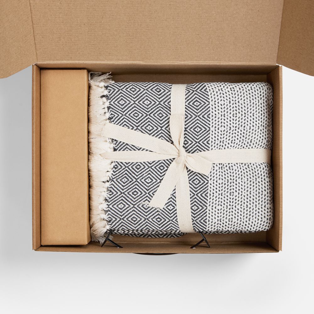 • Материал: плед - хлопок 80%, полиэстер 20%, плотность 260 г/м²; флакон - стекло, палочки - дерево; коробка - микрогофрокартон