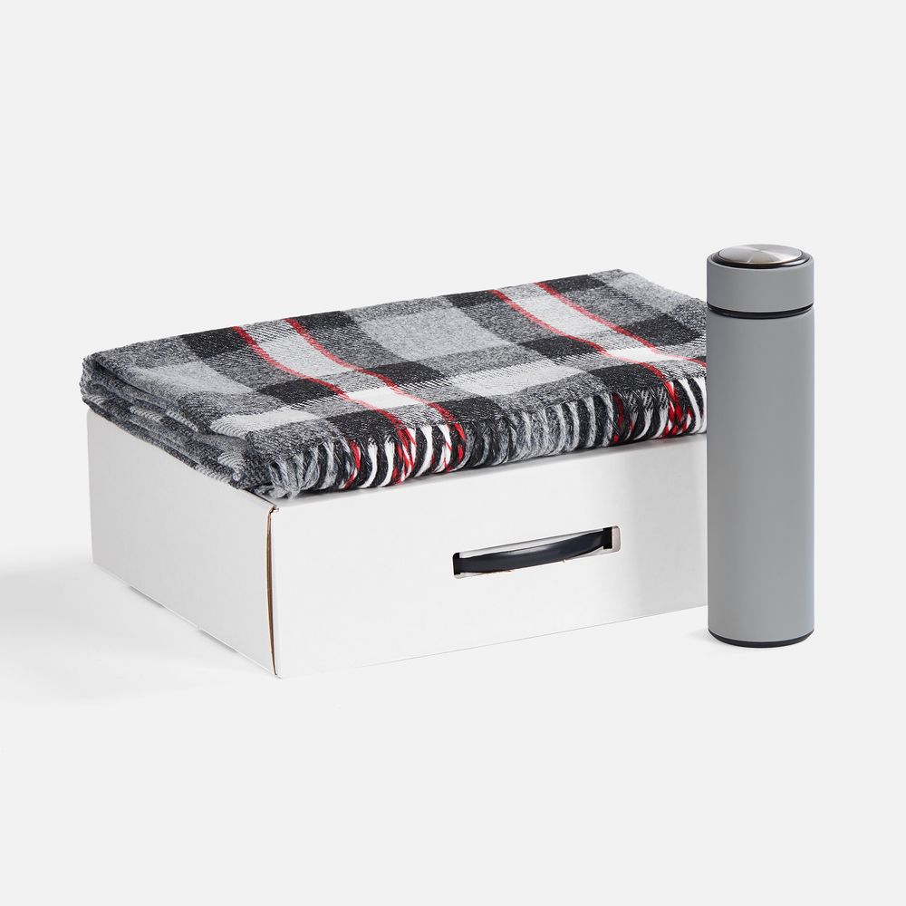 • Материал: плед - шерсть, 15%; хлопок, 5%; полиэстер 60%; акрил, 20%, плотность 200 г/м²; термос - нержавеющая сталь, 304; покрытие софт-тач; коробка - картон