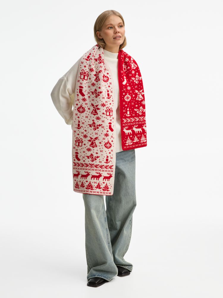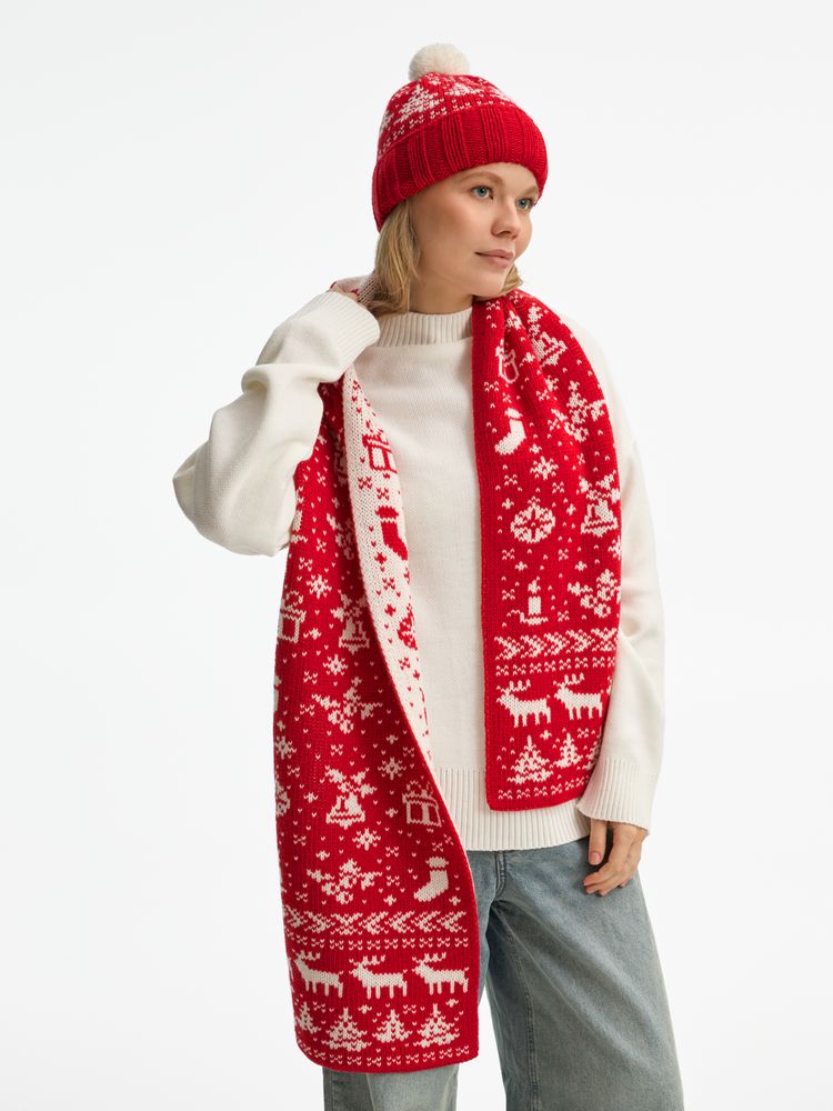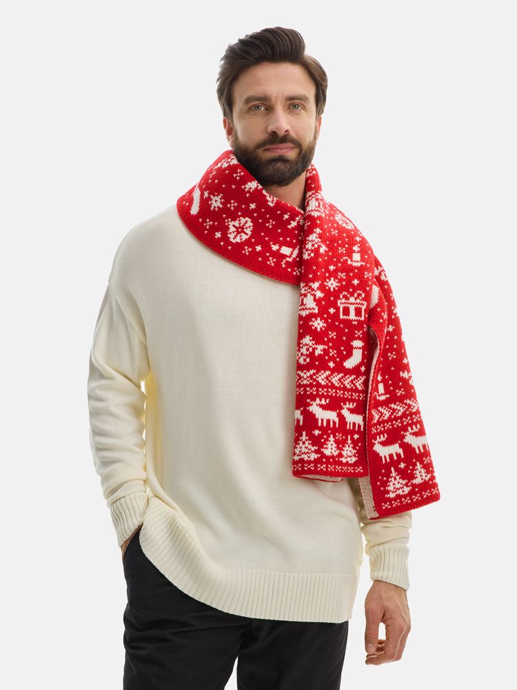 Шарф Holidale выполнен из высокообъемной полушерстяной пряжи, которая дарит тепло и ощущение праздничного уюта. Изысканный жаккардовый узор в традиционных зимних цветах, контрастные сочетания и объемная текстура подчеркивают праздничный характер аксессуара.