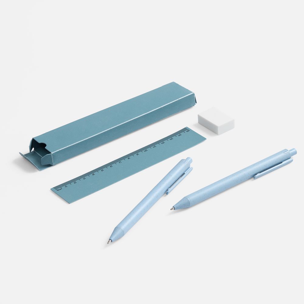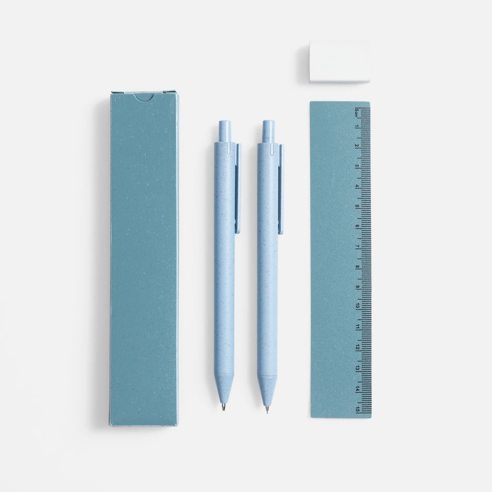 Wheat Hit — лаконичный и экологичный подарок. Весь набор, включая упаковку, выполнен из пластика с добавлением пшеничных волокон. Ручка, механический карандаш, ластик и линейка в коробочке, которая в дальнейшем может служить компактным пеналом.