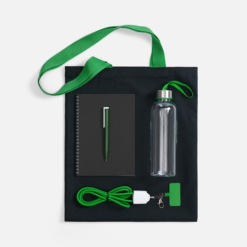 • Материал: сумка - хлопок, 240 г/м²; ручки - полиэстер; кабель-ланьярд - нейлон, пластик; металл; бутылка - пластик, пищевой; крышка - металл, пластик; блокнот - бумага, картон; ручка - пластик