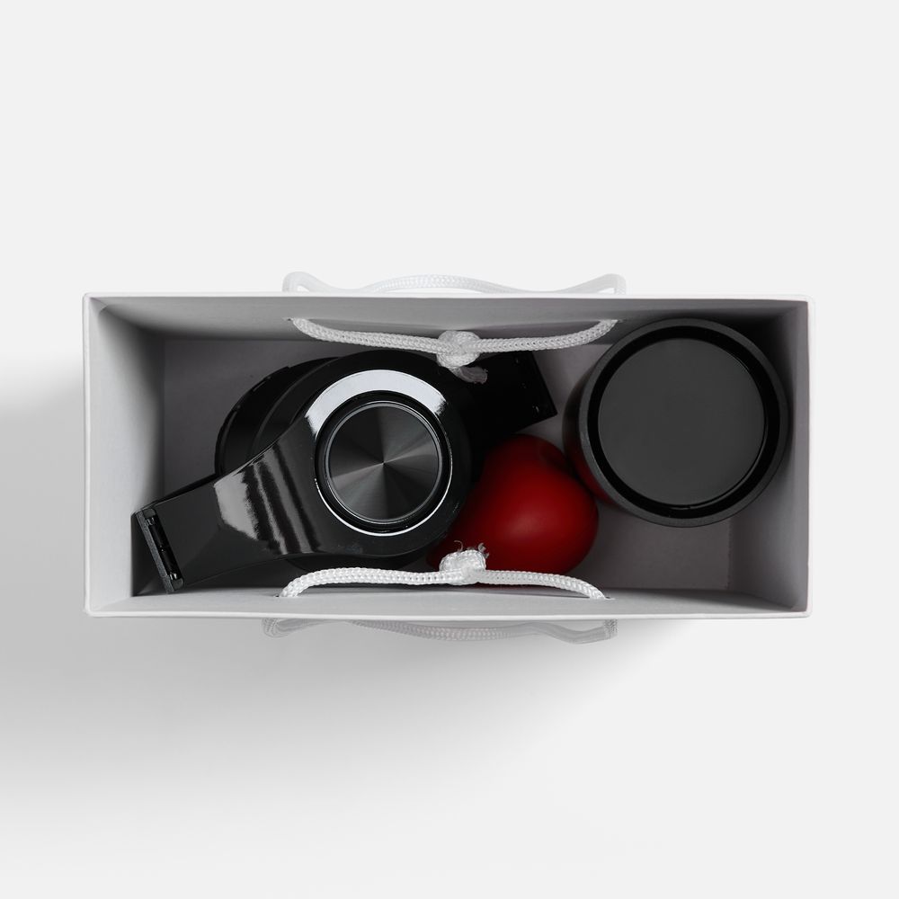 • Материал: наушники - пластик; термостакан - нержавеющая сталь, матовое покрытие; крышка - пластик, силикон; коробка - переплетный картон, бумага Magic; антистресс - вспененный полиуретан