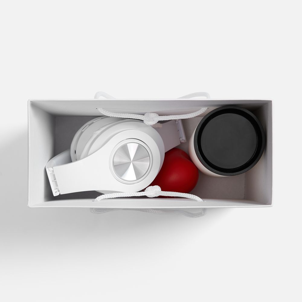 • Материал: наушники - пластик; термостакан - нержавеющая сталь, матовое покрытие; крышка - пластик, силикон; коробка - переплетный картон, бумага Magic; антистресс - вспененный полиуретан
