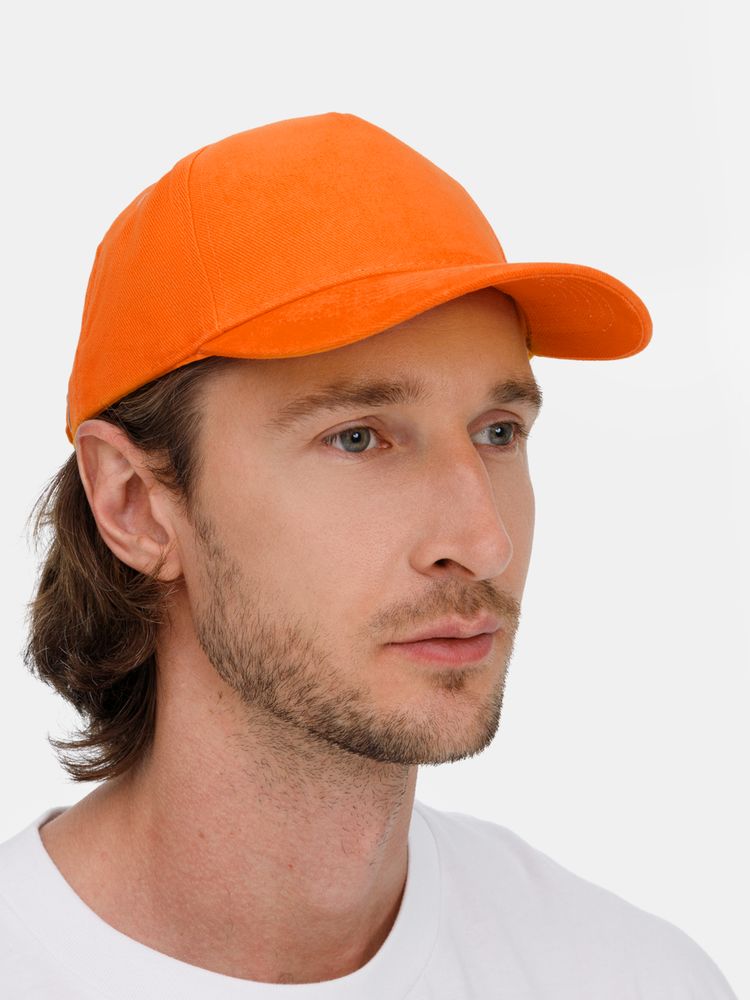 Модель бейсболки с 5-ю клиньями без лобового шва из плотного чесаного хлопка.