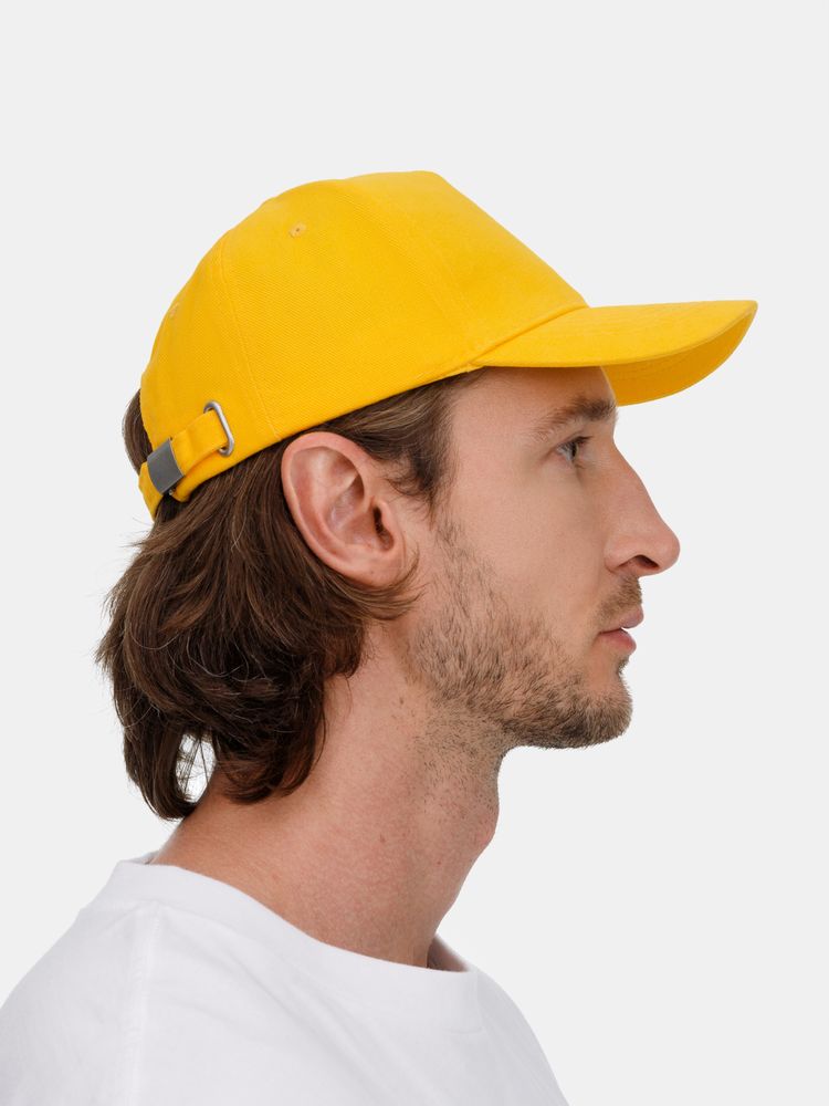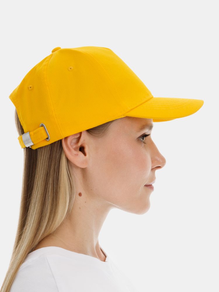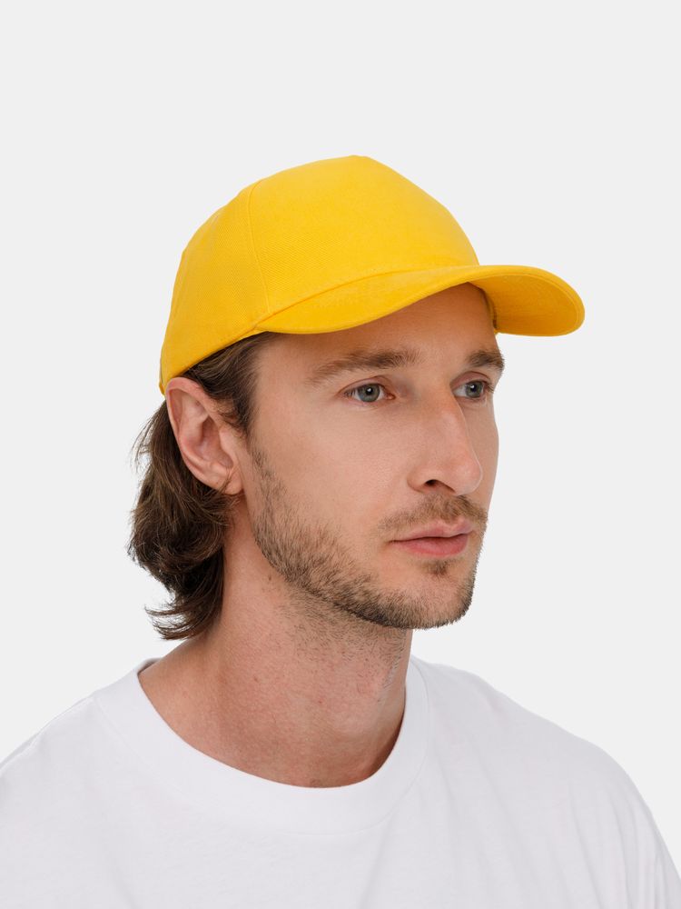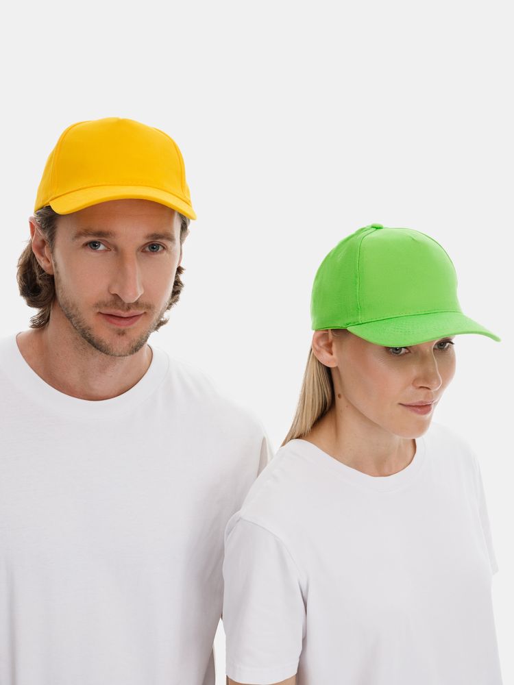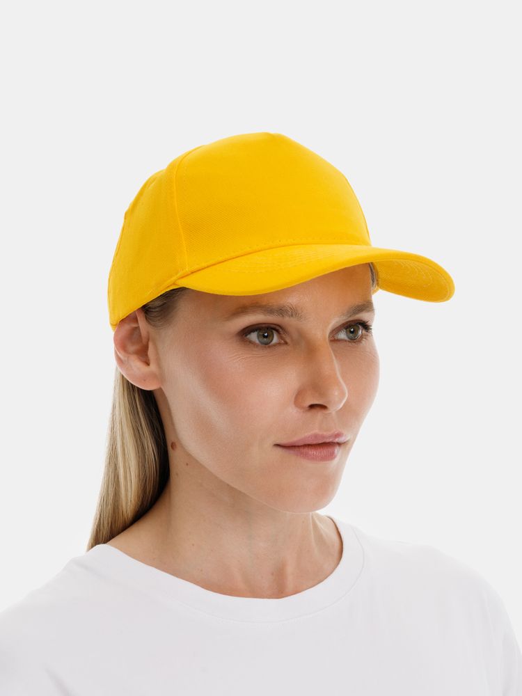 Модель бейсболки с 5-ю клиньями без лобового шва из плотного чесаного хлопка.