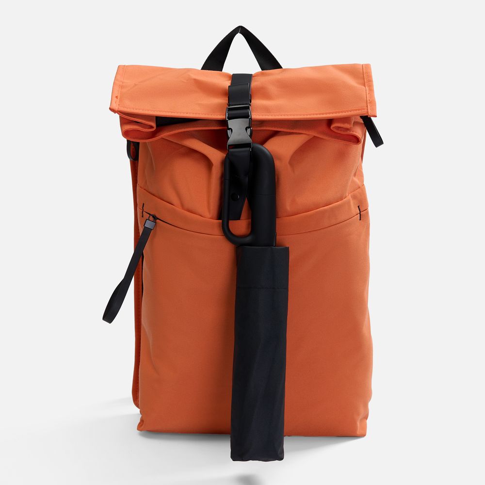 Преимущество обратного сложения заключается в том, что при закрытии внутренняя поверхность зонта остается снаружи, а мокрая сторона — внутри. За ручку-карабин удобно подвесить зонт на рюкзак или сумку.