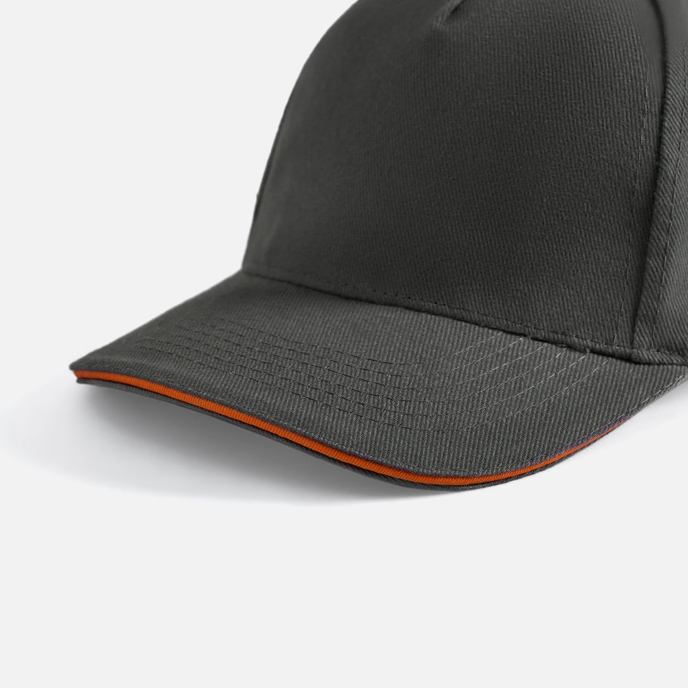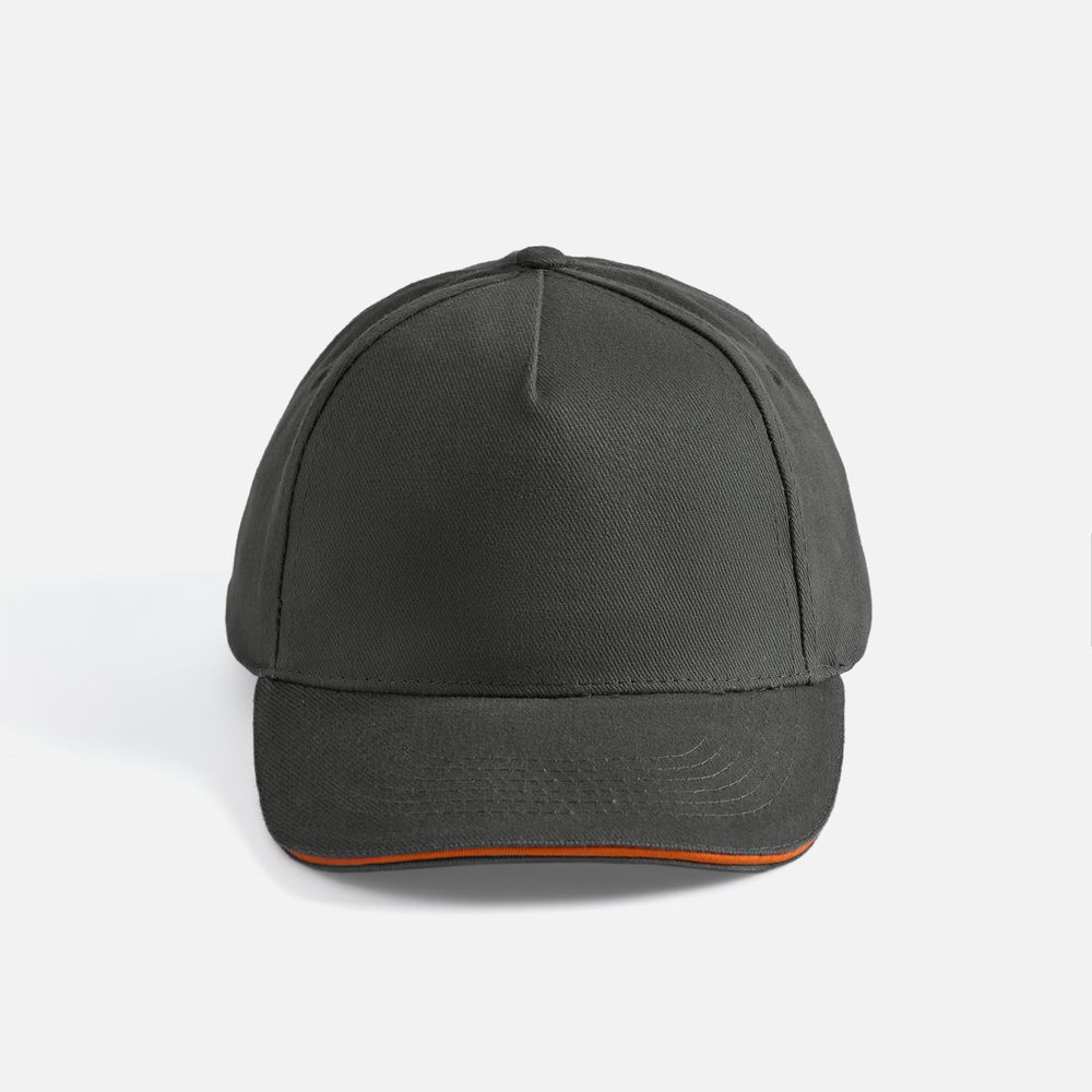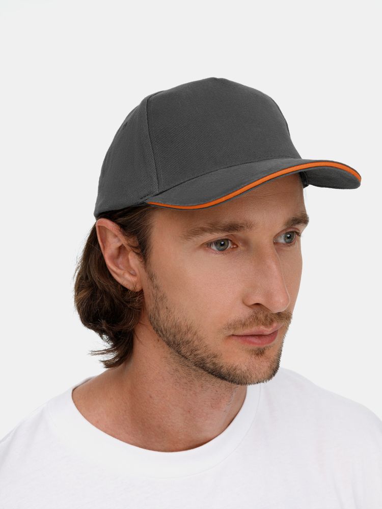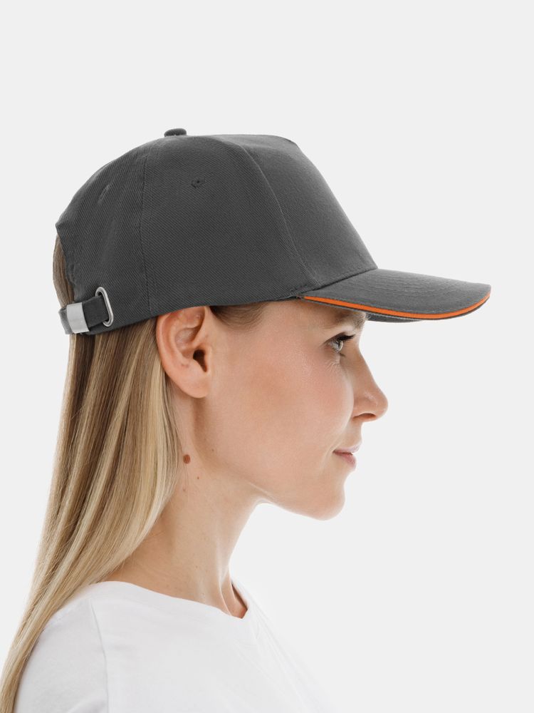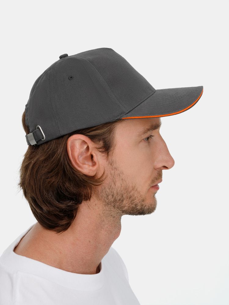 Модель бейсболки с 5-ю клиньями без лобового шва из плотного чесаного хлопка.