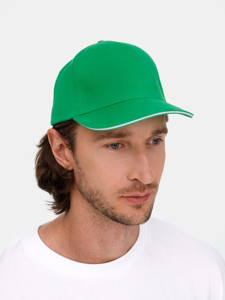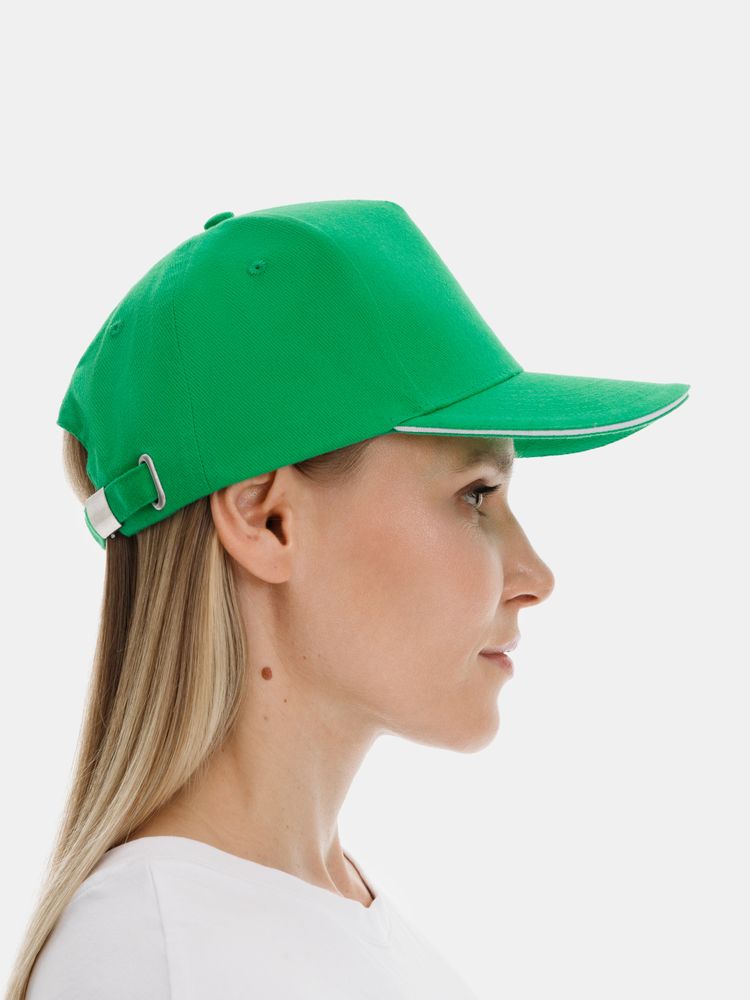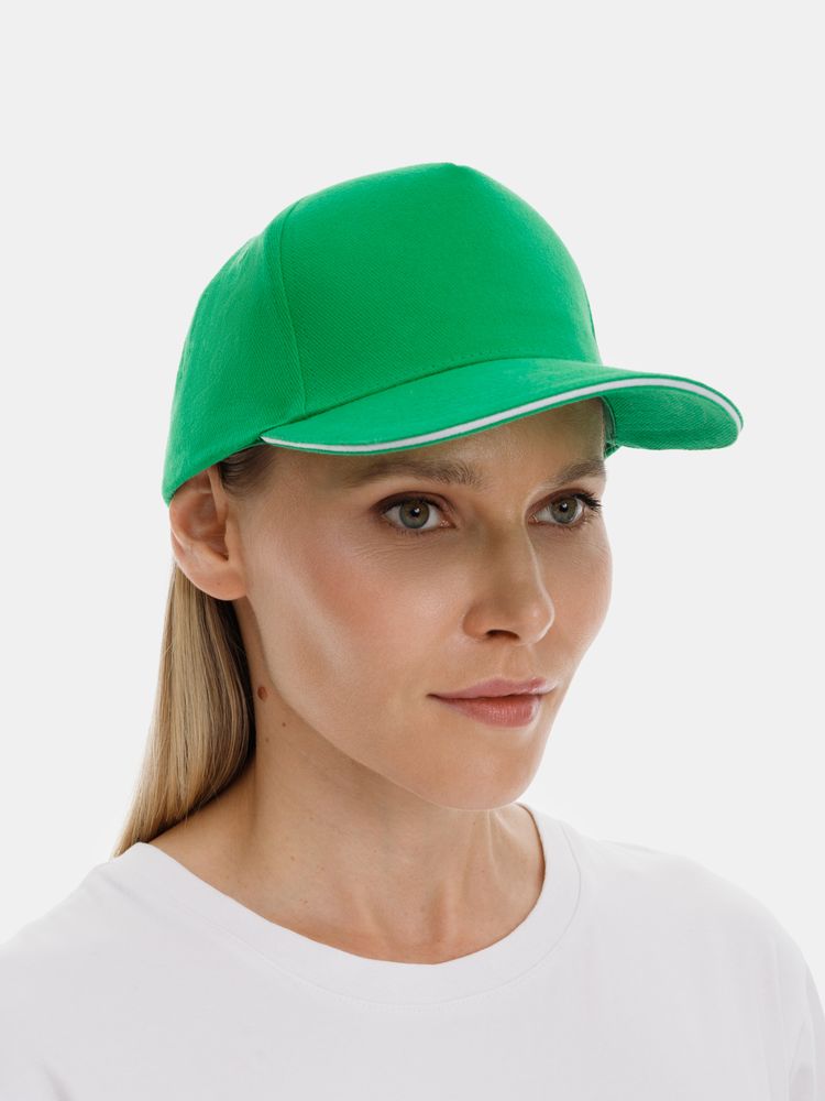 Модель бейсболки с 5-ю клиньями без лобового шва из плотного чесаного хлопка.