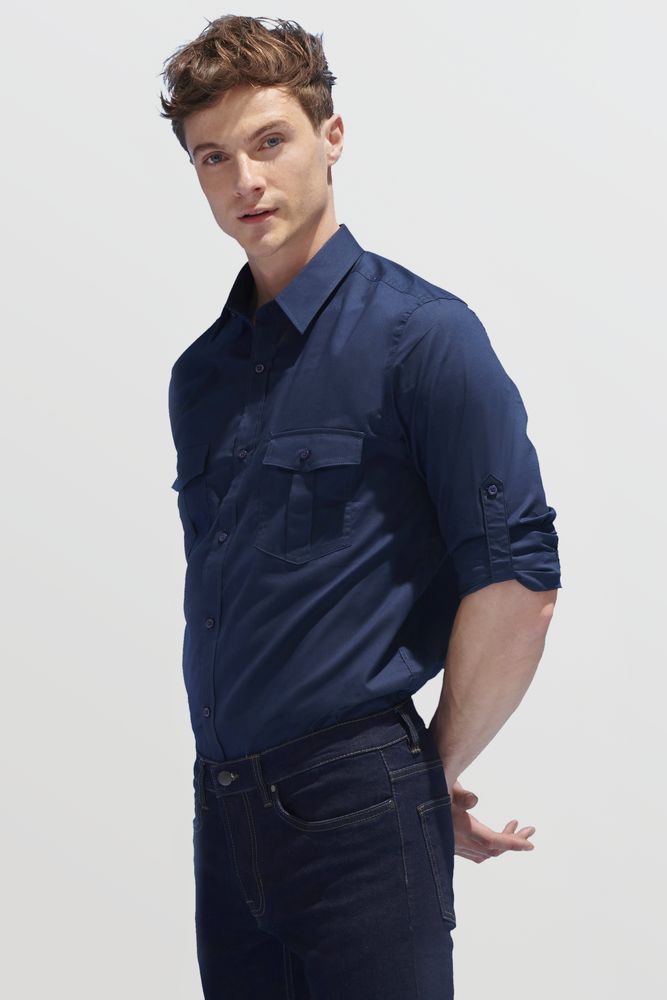Рубашка прямого кроя в стиле «сафари» с планкой на 7 пуговиц в тон и манжетами на 1 пуговице.