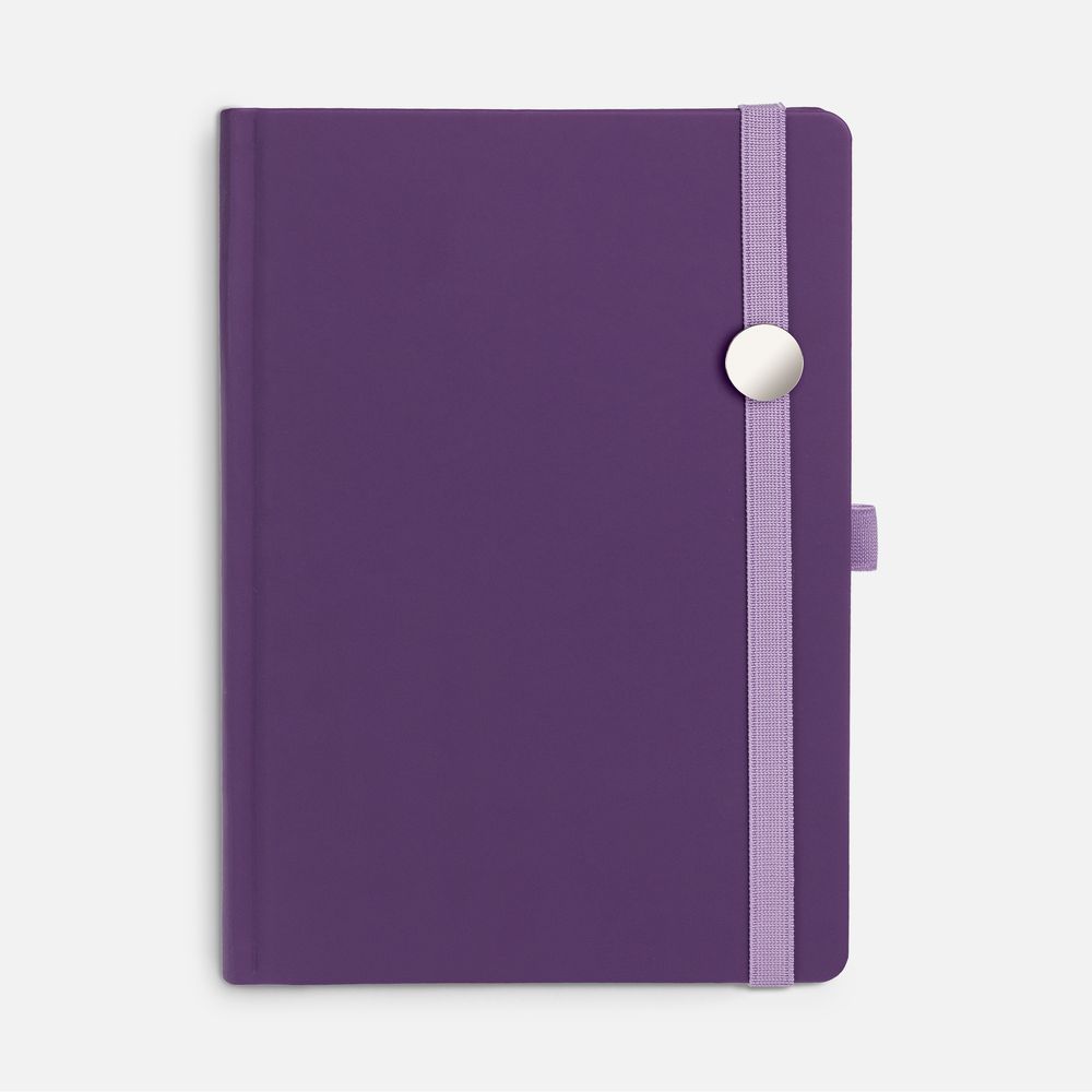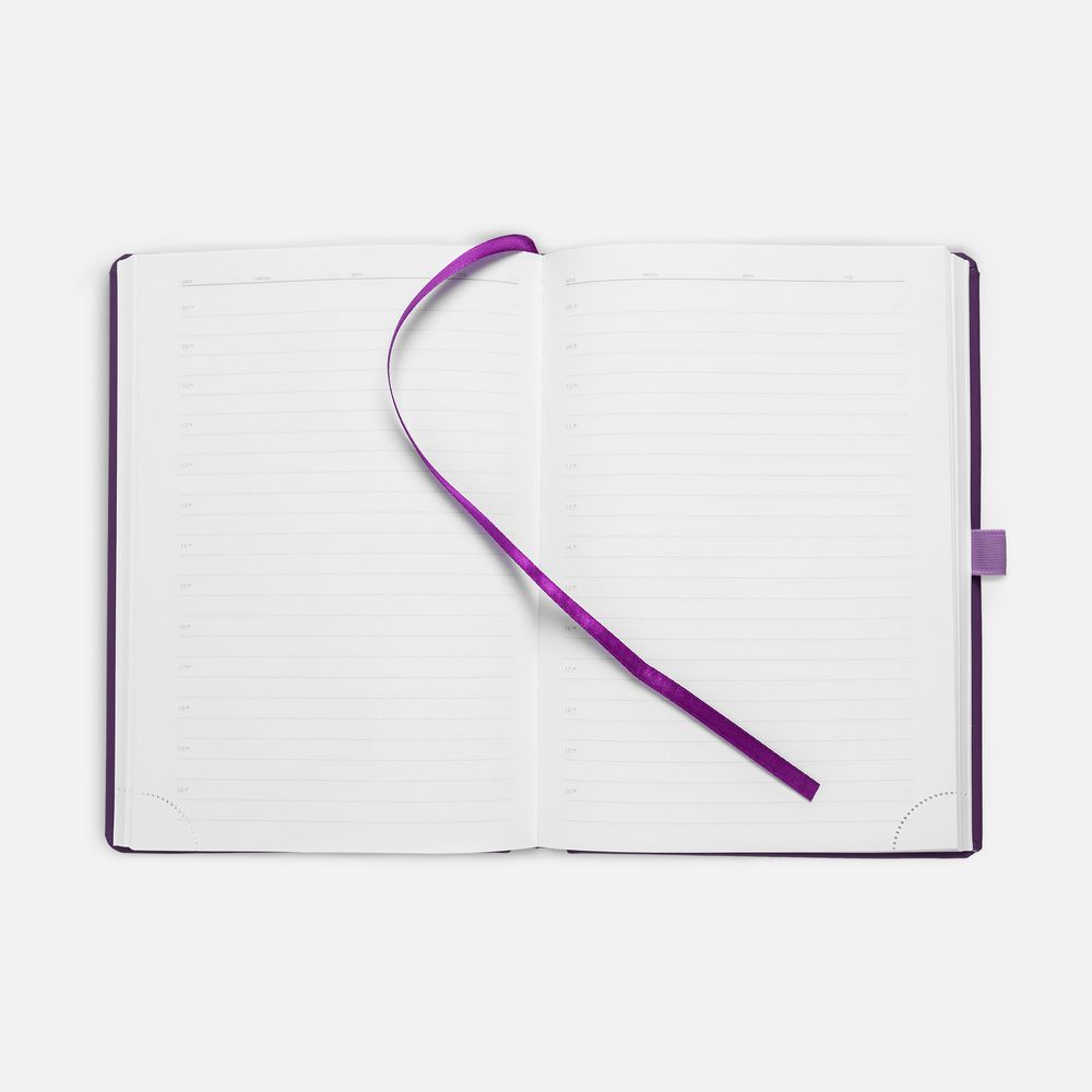 Ежедневник с твердой обложкой без поролона, выполнен из материала Soft Touch, фиолетовый UU, дополнен резинкой шириной 1 см, петлей-резинкой для ручки, капталом и ляссе в цвет обложки.